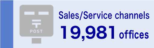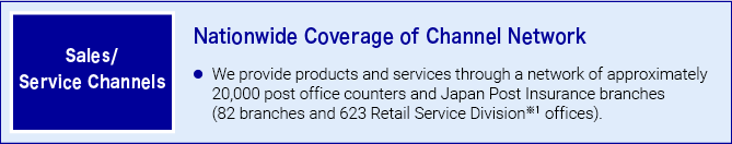 Through the nationwide network of post offices, Japan Post Insurance branches and Retail Service Division※1 offices, we provide our products and services to individual customers and corporate customers.