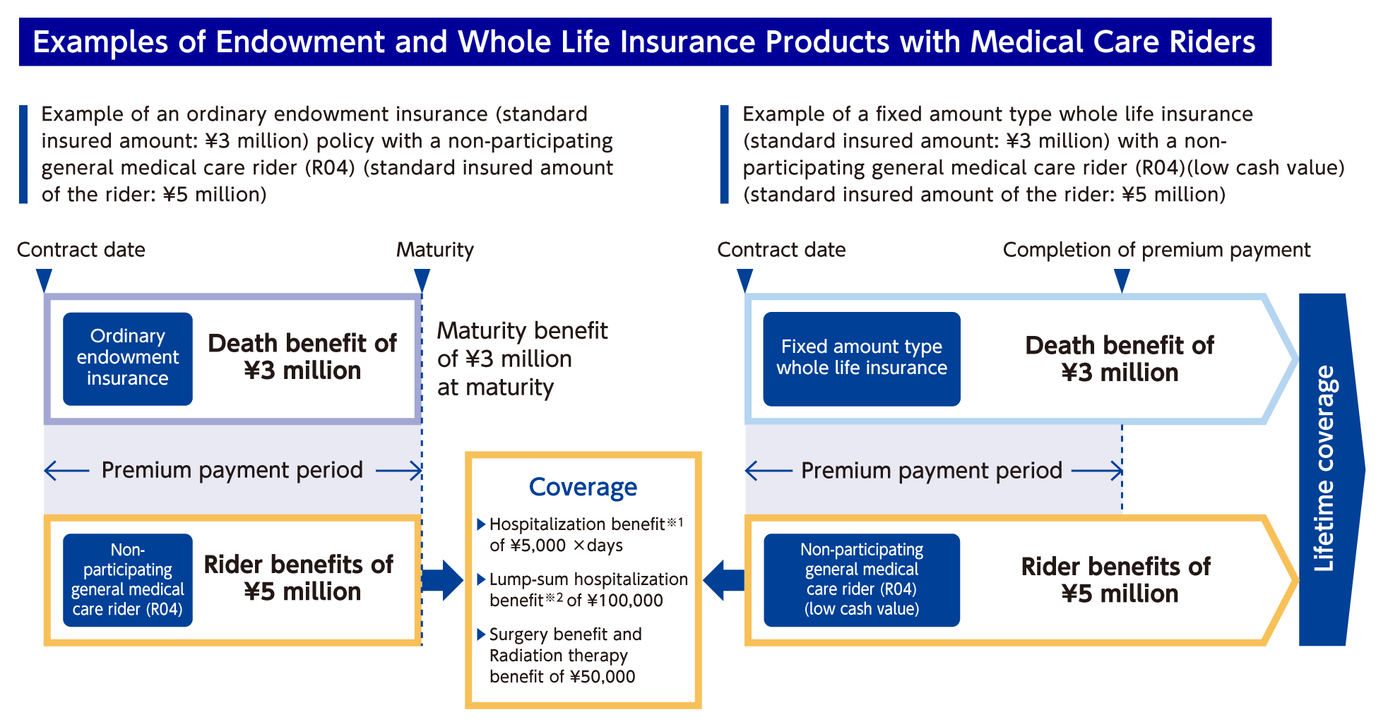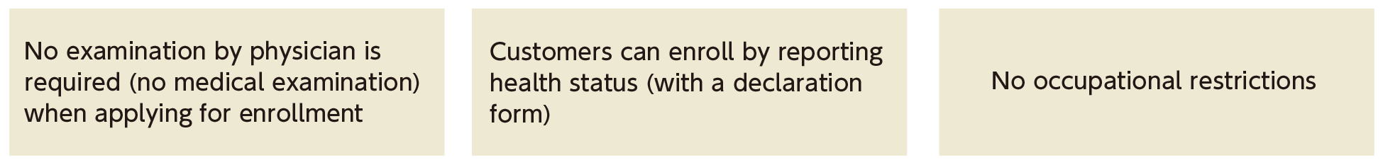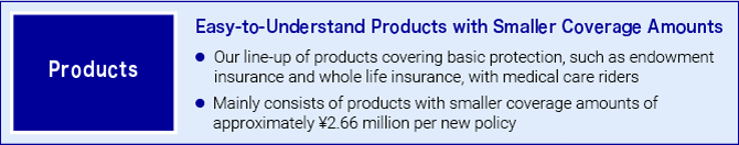 Our products cover basic protection that pays death benefits, maturity benefits, and survival benefits with medical care protection (riders) for injuries and illnesses. We provide simple and easy-to-understand products (with easy procedures and smaller coverage amounts) and services, focusing on endowment insurance and whole life insurance, through the nationwide network of post offices.