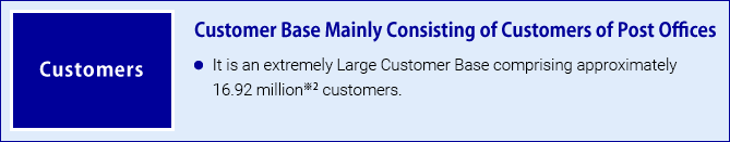 We provide simple and easy-to-understand products with smaller coverage amounts focused on endowment insurance and whole life insurance and various services through the nationwide network of post offices, and operate a unique business model that differs from that of competitors in Japan.