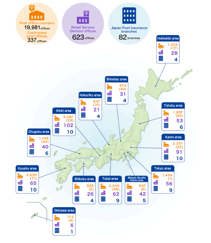 ※2 The numbers in () are the number of Contracted post offices in each area.