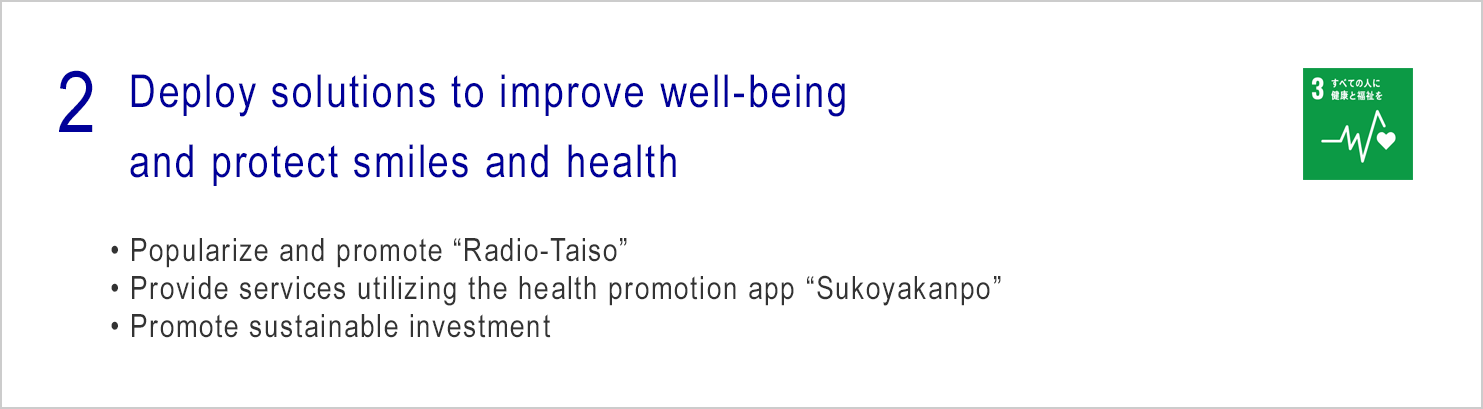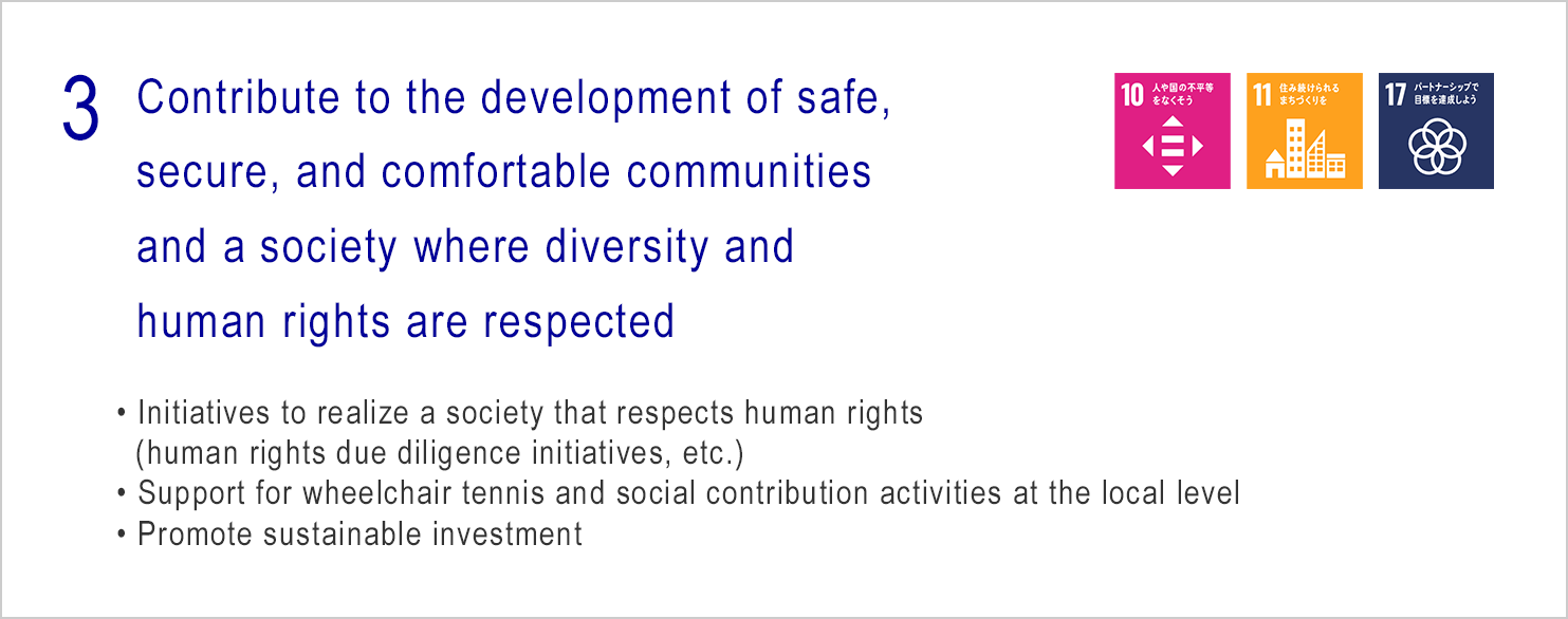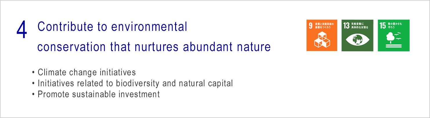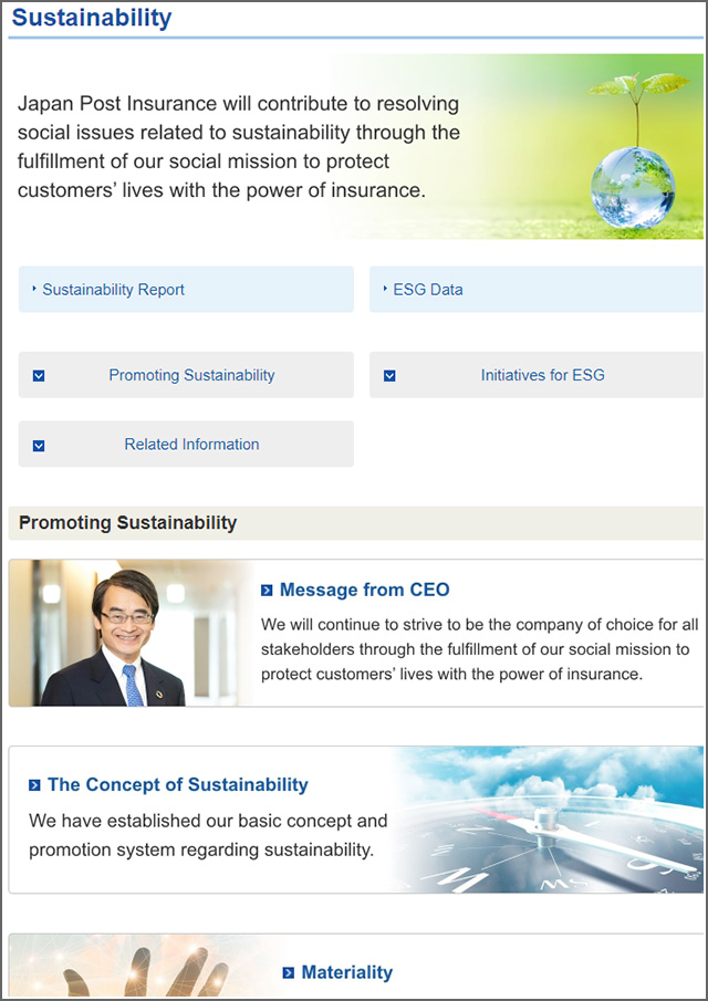 And now, under our management philosophy “Be a trustful partner for people, always being close at hand and endeavoring to protect their well-being,” we are advancing the promotion of sustainability based on the concept of helping to resolve social issues and working to achieve SDGs by fulfilling our social mission (purpose) and meeting social needs in an age of the 100-year life.