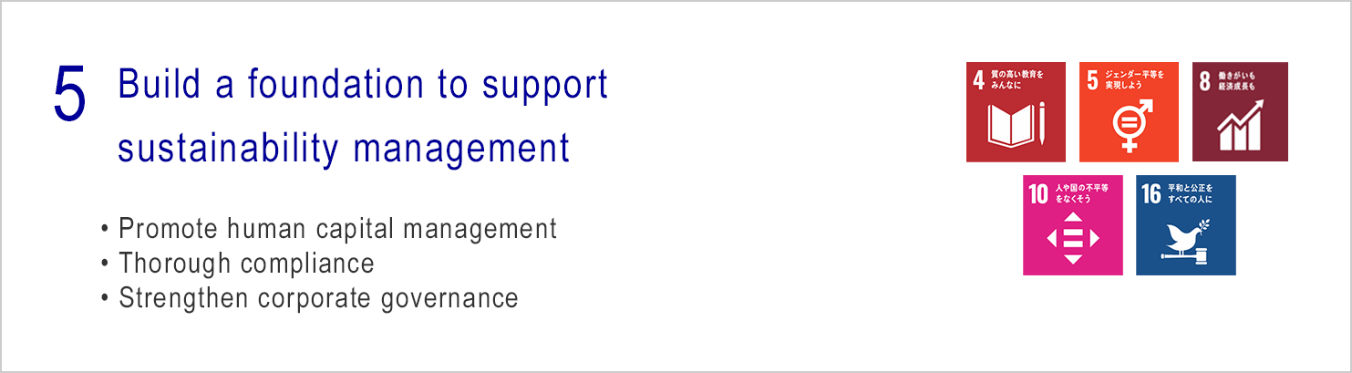We has identified the following five materiality items (important issues) and promotes various initiatives in line with them in order to fulfill our social mission and address various issues related to sustainability.