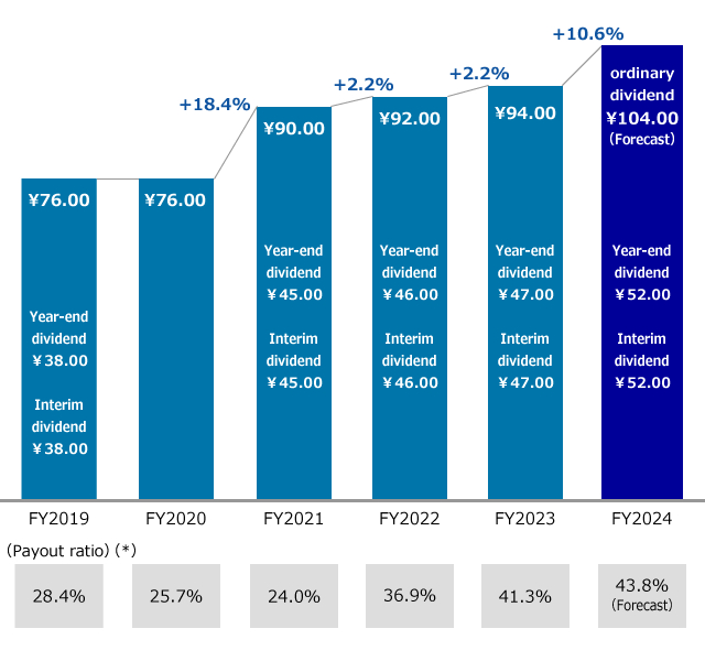 Furthermore, with the primary aim of returning profits to shareholders flexibly, the Company will strive to achieve an average total payout ratio from 40% to 50% in the medium term by engaging in the agile acquisition of treasury stock and other means.