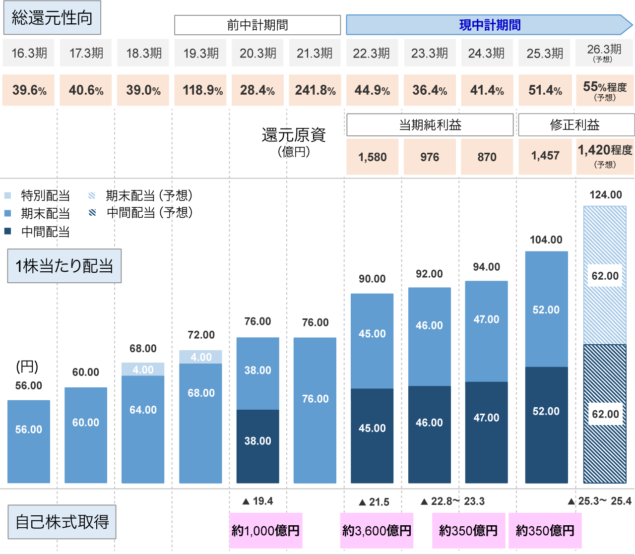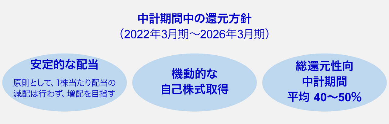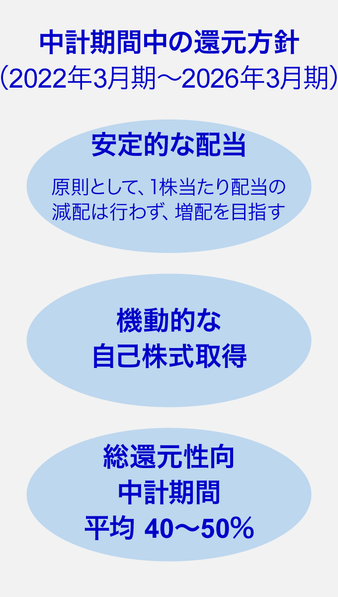 さらに、株主のみなさまに対する柔軟な利益還元を図ること等を目的として、機動的な自己株式取得等を行うことで、総還元性向について中計期間平均40~50%を目指してまいります。
