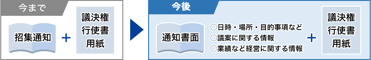 株主さまへは、通知書面に議決権行使に必要な情報として、議案に関する情報についても記載し、議決権行使書用紙とともに送付する予定です。