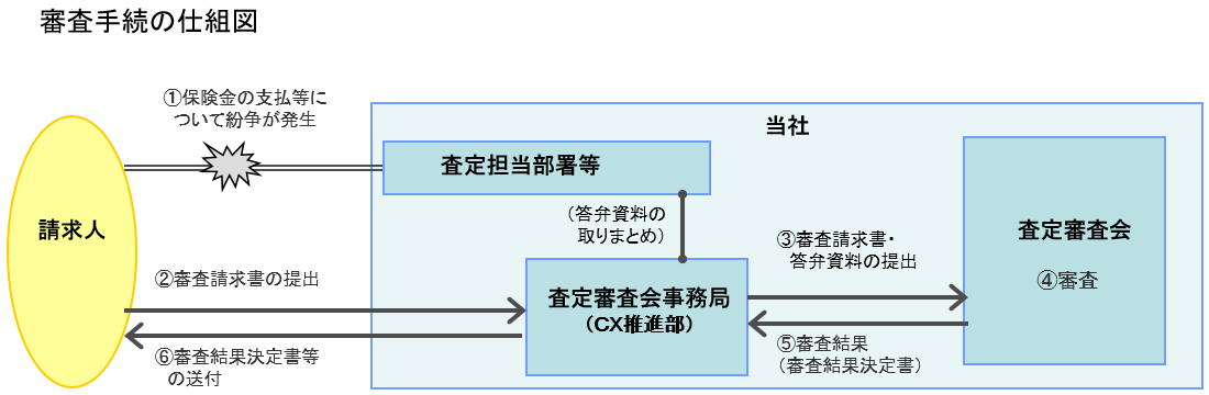 | (3) 審査方法等 | 請求人が提出した審査請求書及び当社内で取りまとめた答弁資料(当該紛争についての当社の対応方針及び関係書類を整理したもの)に基づいて審査を行います(書面審理)。 審査の過程で、必要に応じ、追加調査を行うことがあります。 審査の結果によって権利を害されるおそれのある方がいる場合は、その方に審査手続への参加を呼びかけることがあります。 |