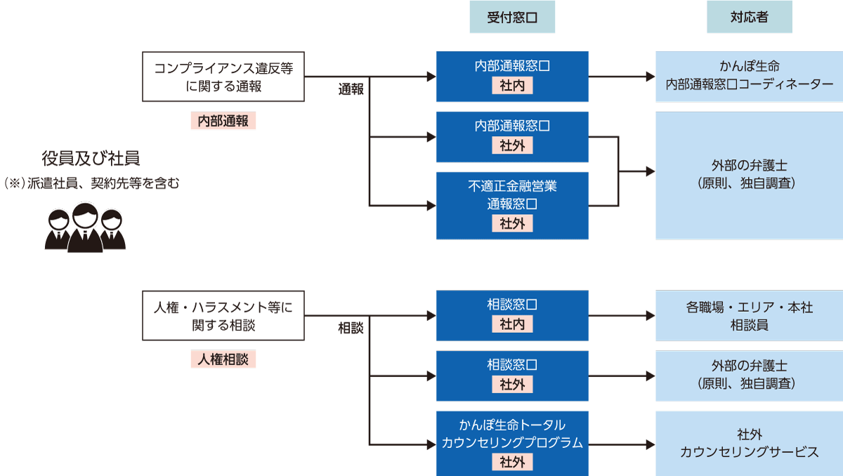 コンプライアンス違反またはそのおそれのある行為の早期検知・解決を図るため、社員(派遣社員を含む)などを対象とした内部通報窓口を本社コンプライアンス統括部および社外の弁護士事務所に設けています。また、金融商品の不適正営業に関する専用の内部通報窓口を社外の弁護士事務所に設置しています。内部通報窓口への通報は、利便性の観点から、電話、メール、郵便での通報を受け付けているほか、各種通報・相談を一元的に受け付け、Webサイト上で窓口担当者とのやり取りができる専用ポータルサイト「ワンストップ相談・通報プラットフォーム」を導入しています。
