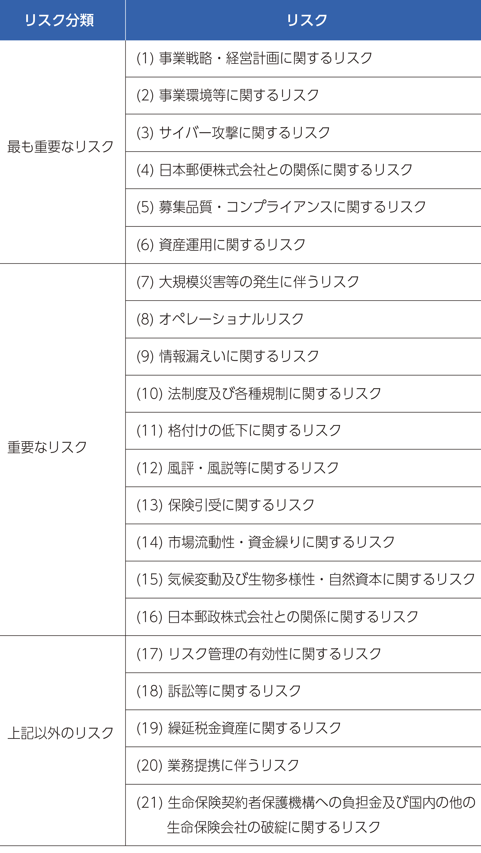当社では、経営者が当社グループの財政状態、経営成績およびキャッシュ・フローの状況ならびに企業価値を表すEV(Embedded Value)や健全性を表すESR(Economic Solvency Ratio)等の指標に重要な影響を与える可能性があると認識している主要なリスクを「事業等のリスク」とし、「影響度」と「発生可能性」を勘案した上で「最も重要なリスク」及び「2025年度にかけてリスク認識が高まっている又は2025年度にリスク認識が高まると認識しているリスク」を特定し、年度を通じて管理しております。