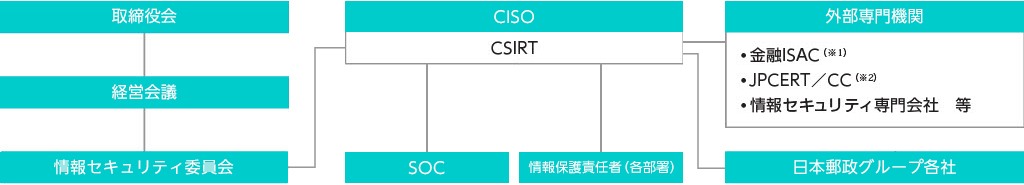 これらの活動にあたっては、社内に情報セキュリティ委員会を設置し、経営陣のリーダーシップで対策を推進しているほか、「日本郵政グループサイバーセキュリティ経営宣言」に基づき、日本郵政グループ各社と連携しながら取り組んでいます。また、情報セキュリティ委員会での検討・協議の状況は、定期的に経営会議に報告するとともに、重要なものについては、経営会議で協議・決定のうえ、取締役会へ報告しています。