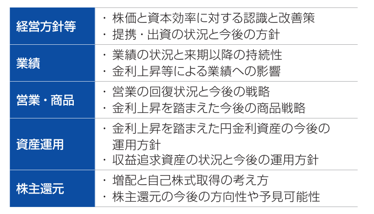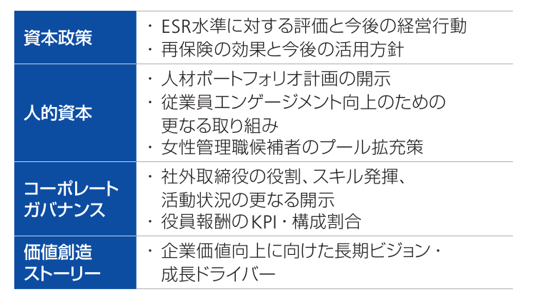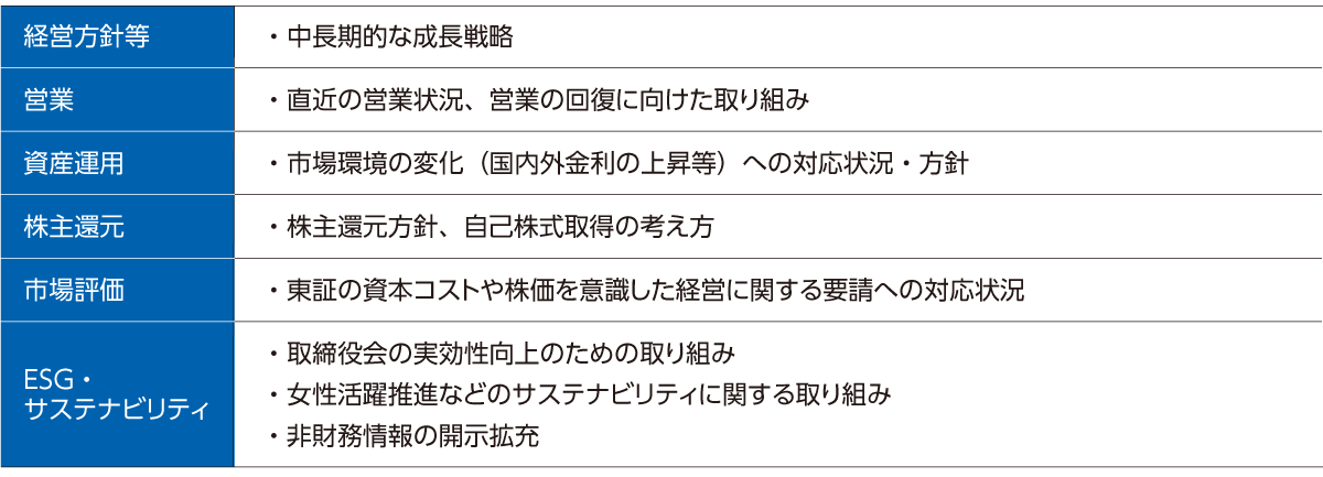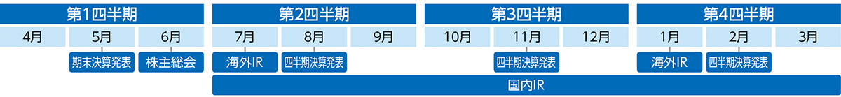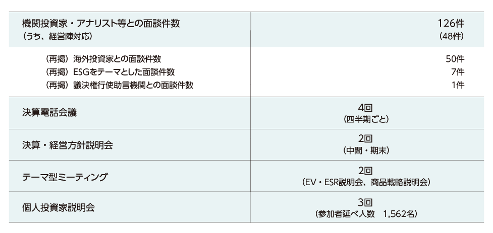 国内外の機関投資家の皆さまに対しては、四半期ごとの決算発表後、電話会議や決算説明会等を開催し、経営陣が経営戦略・財務状況などについて説明しています。また、機関投資家の皆さまの関心事項にお応えできるよう、個別の面談などの場も活用して対話を実施しており、2024年度はサステナビリティの取り組みをテーマにした説明会を開催し、投資家向けのIRイベントに社外取締役が初めて登壇しました。