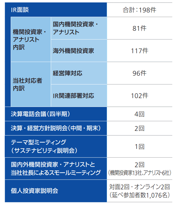 また、株主・投資家の皆さまとの「建設的な対話」を重視しており、対話を通じていただいたご意見等を、経営陣を含む社内へフィードバックすることで、当社の持続的な成長と企業価値の向上につなげています。