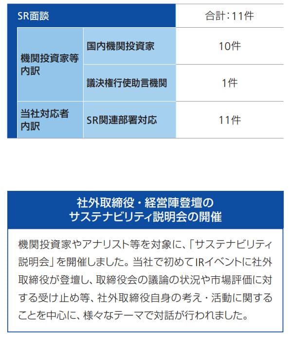 今後も、株主・投資家の皆さまと活発な対話を行えるよう、IR・SR(注)活動の推進に取り組んでいきます。