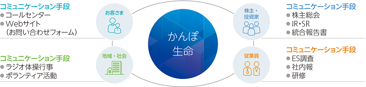 当社は、ステークホルダーの皆さまとの対話を通じて、当社への要請や期待を的確に把握し、それらに応えていくことが、企業価値向上に不可欠であると認識し、経営方針においても「すべてのステークホルダーと密接なコミュニケーションを図ります。」と宣言しています。ステークホルダーの皆さまからの声を経営改善に活かすとともに、適切な協働・持続的な共生を目指しています。