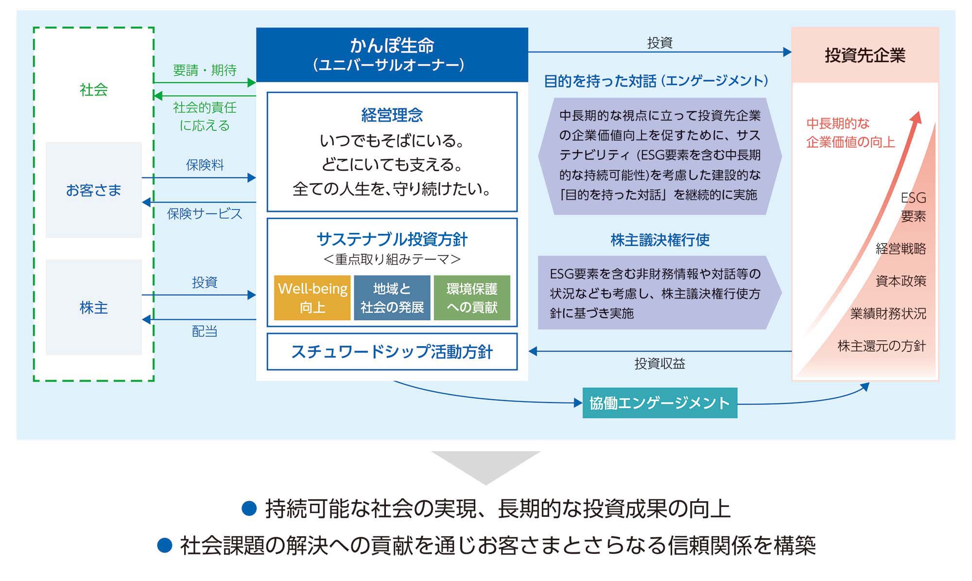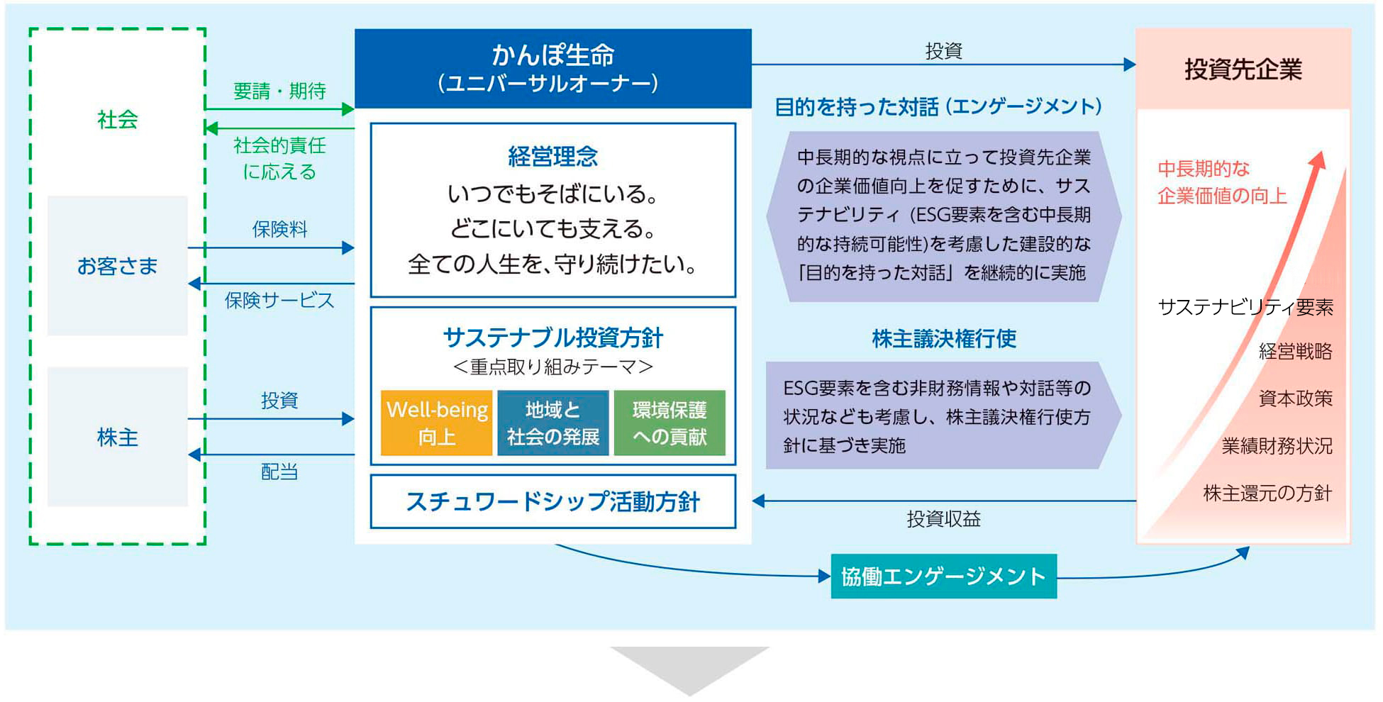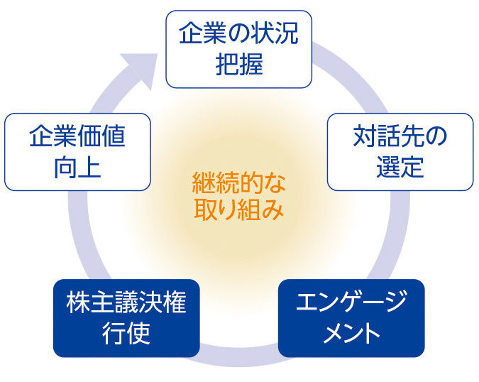 投融資先企業等とは、中長期的な企業価値向上を目指し、「目的を持った対話」(エンゲージメント)を実施しています。そのうえで、投融資先企業等のサステナビリティ(ESG(環境、社会、ガバナンス)を含む中長期的な持続可能性)に対する取り組みやそれと連動した中長期的な経営戦略などの状況の的確な把握に努めます。また、取締役会構成や役員報酬、株主還元を含む資本政策、情報開示方針、気候変動、生物多様性、人権、人的資本などについて対話し、課題に対する取り組み等を確認するとともに、課題認識の共有を図ります。