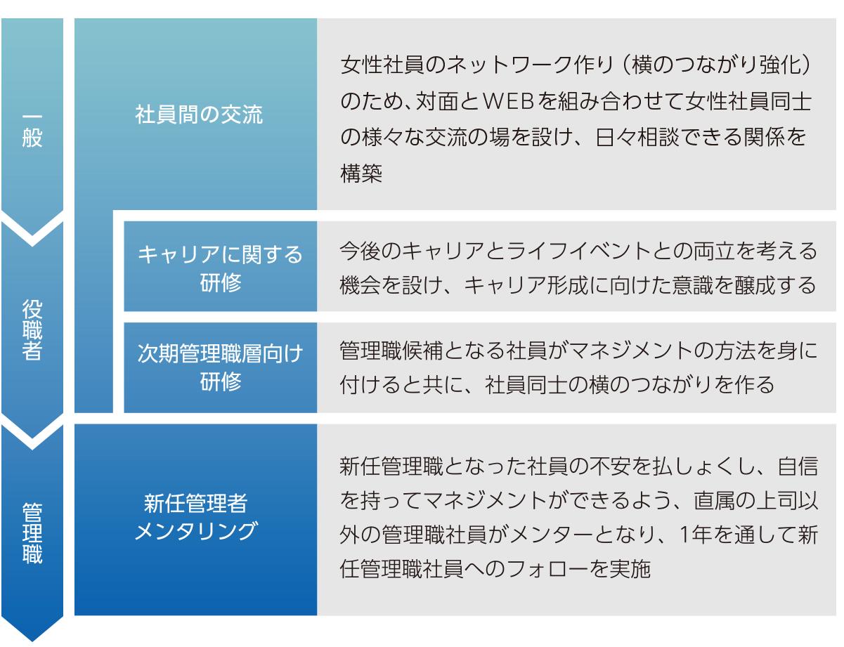 特に、将来管理者として活躍することが期待できる女性社員を対象に、管理職への昇職意識の醸成やスキルの付与を目的とした研修等を行っています。