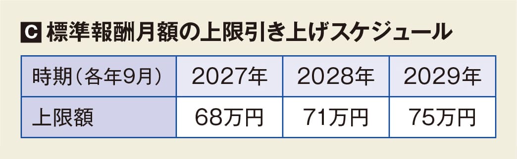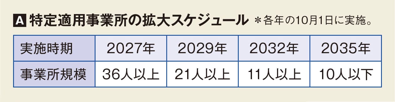 もうひとつは、特定適用事業所の拡大。現在は従業員51人以上の事業所が対象だが、その規模が段階的に縮小され、35年には全ての事業所が対象になる(表「A」参照)。 直近の予定では、27年10月から従業員36人〜50人の事業所に適用される。