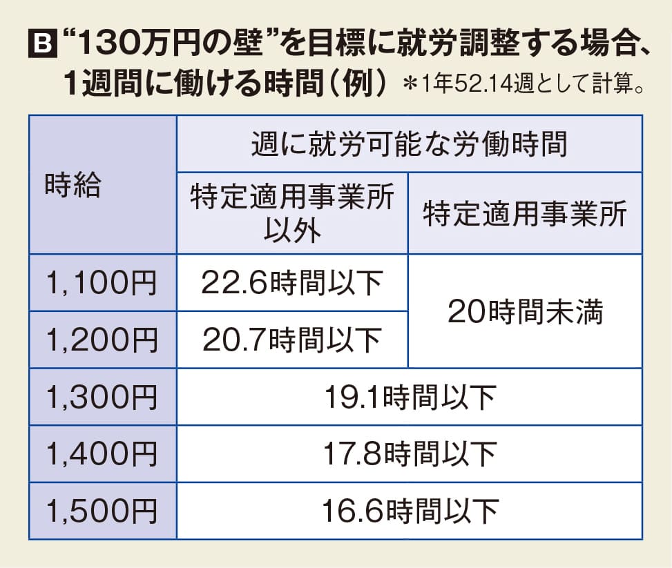 〝130万円の壁〟が目標の場合、例えば時給1,100円の人は、表「B」のように週22.6時間働いても壁を超えなかった。その人が週20時間未満に抑えようとする可能性がある。