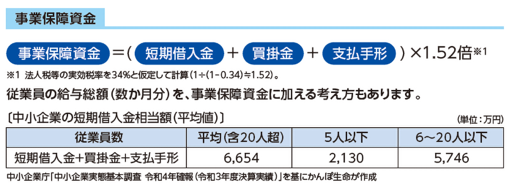 従業員の給与総額(半年分ないし1年分)を、事業保障資金に加える考え方もあります。