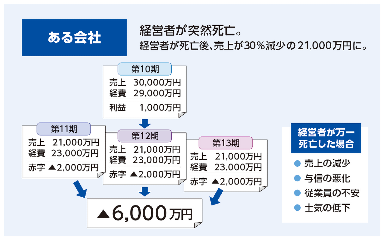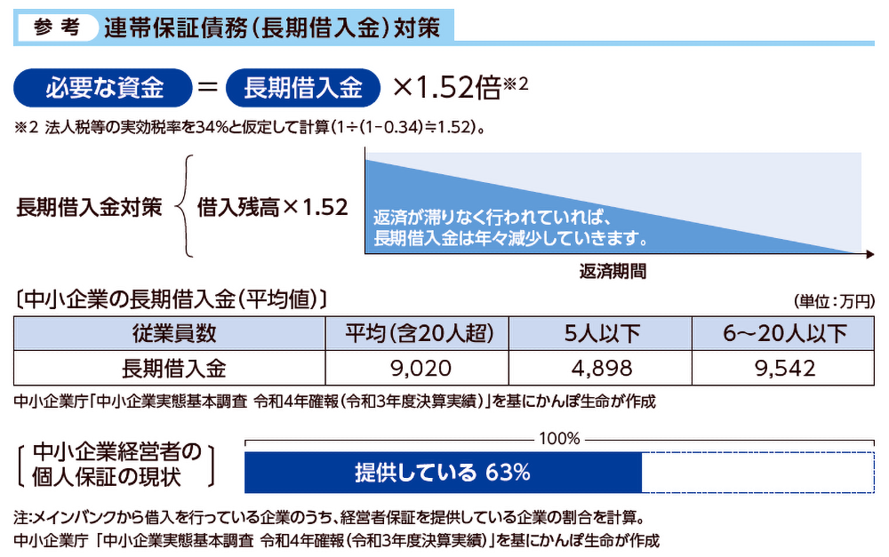 経営に影響を及ぼす外的要因を把握し、一時的な業績低下に耐え抜くための金額を準備しておけば、会社の存続に役立ちます。資金を確保しておくことで、後継者が金融機関からの信用を得るまで融資を受けることが難しくなる場合にも備えられます。特に長期借入金に経営者個人が連帯保証人となっている場合は、経営者に万一があった場合に連帯保証債務が相続人に引き継がれるため事前の対策が重要です。