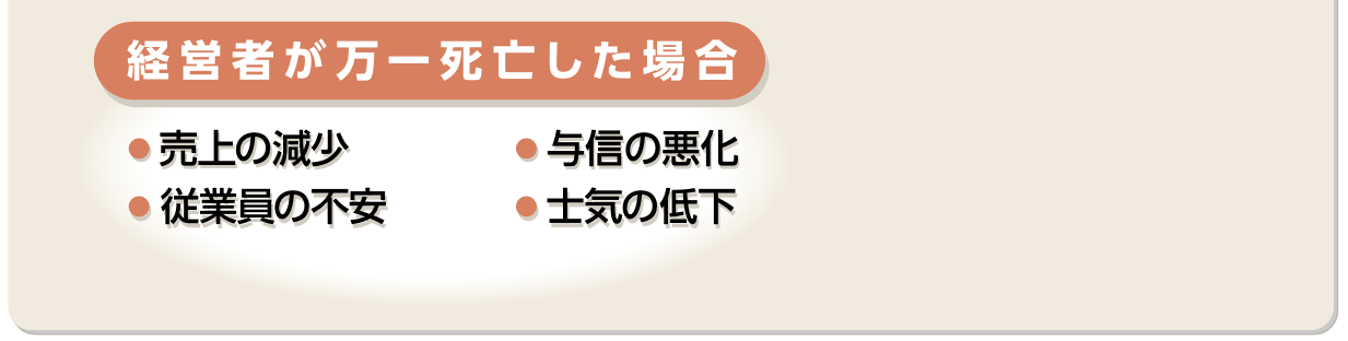 さまざまな不測の事態を想定し、必要な事業保障額を算定します。財務状況とのバランスを見ながら必要資金を準備することになりますが、効率よく資金を活用するために、保険という手段で備えることもできます。