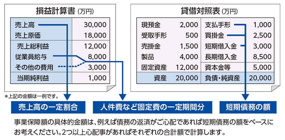 事業保障額の具体的金額は、例えば債務の返済がご心配であれば短期債務の額をベースにお考えください。2つ以上心配事があればそれぞれの合計額で計算します。