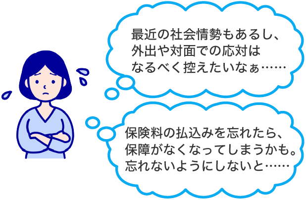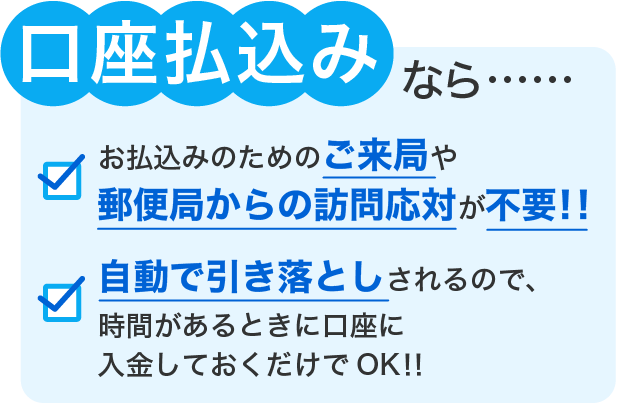 かんぽ生命では、毎月の保険料を「窓口払込」「集金払込」でお支払いいただいているお客さまに対し、口座払込みをおすすめしています。さまざまなメリットがありますのでぜひご検討ください。