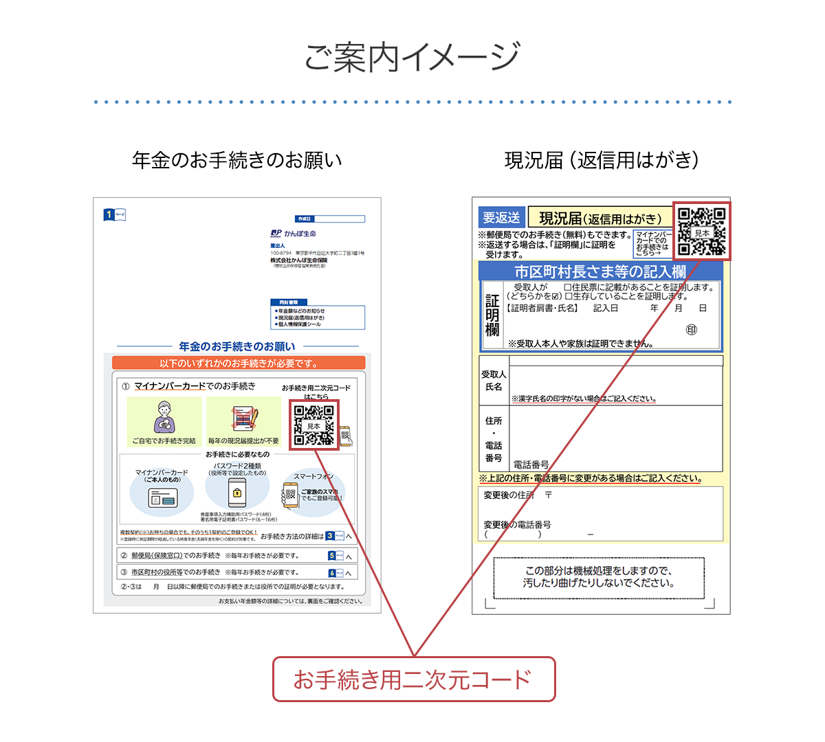 対象となるお客さまには、お手続き用二次元コードを印字したご案内(年金のお手続きのお願い・現況届(返信用はがき))をお送りしています。