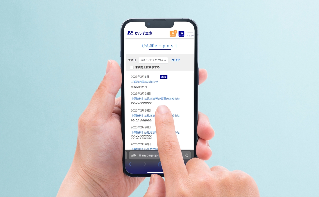 「かんぽe-post」とは、ご契約に関する重要なご案内やお申込時等にお渡しする書類を、「マイページ」(無料)上で、いつでもどこでもご確認いただけるサービスです。