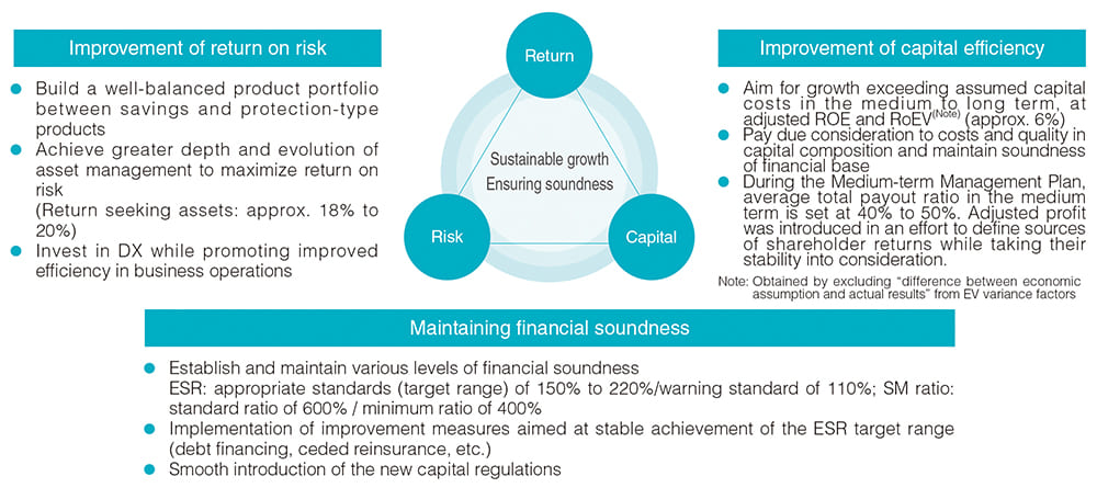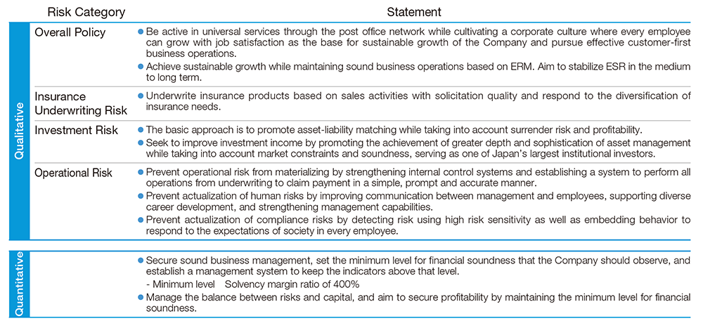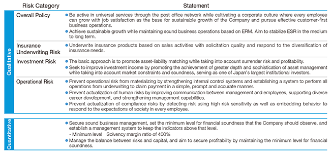 The Risk Appetite Statement stipulates that we shall realize sustainable growth and enhancement of the Company's corporate value over the medium to long term while securing soundness in business management based on ERM. We will aim to secure revenues considering efficiency with respect to capital and risks, while securing financial soundness.