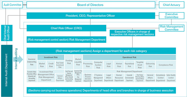 Each of the Executive Officers in charge of risk management sections operate and upgrade the systems for managing their respective assigned risks by ascertaining the presence, types and profile of risk, as well as the risk management techniques and systems as prescribed by the Basic Risk Management Policy. While operating a mutual checks and balances system with departments of the head office and branches in charge of business execution, risk management sections appropriately fulfill their monitoring role and manage their assigned risks in accordance with risk management standards. As investment risk and operational risk have multiple subcategories, we have designated a department for handling comprehensive risk management in conjunction with the risk management sections for respective subcategories.