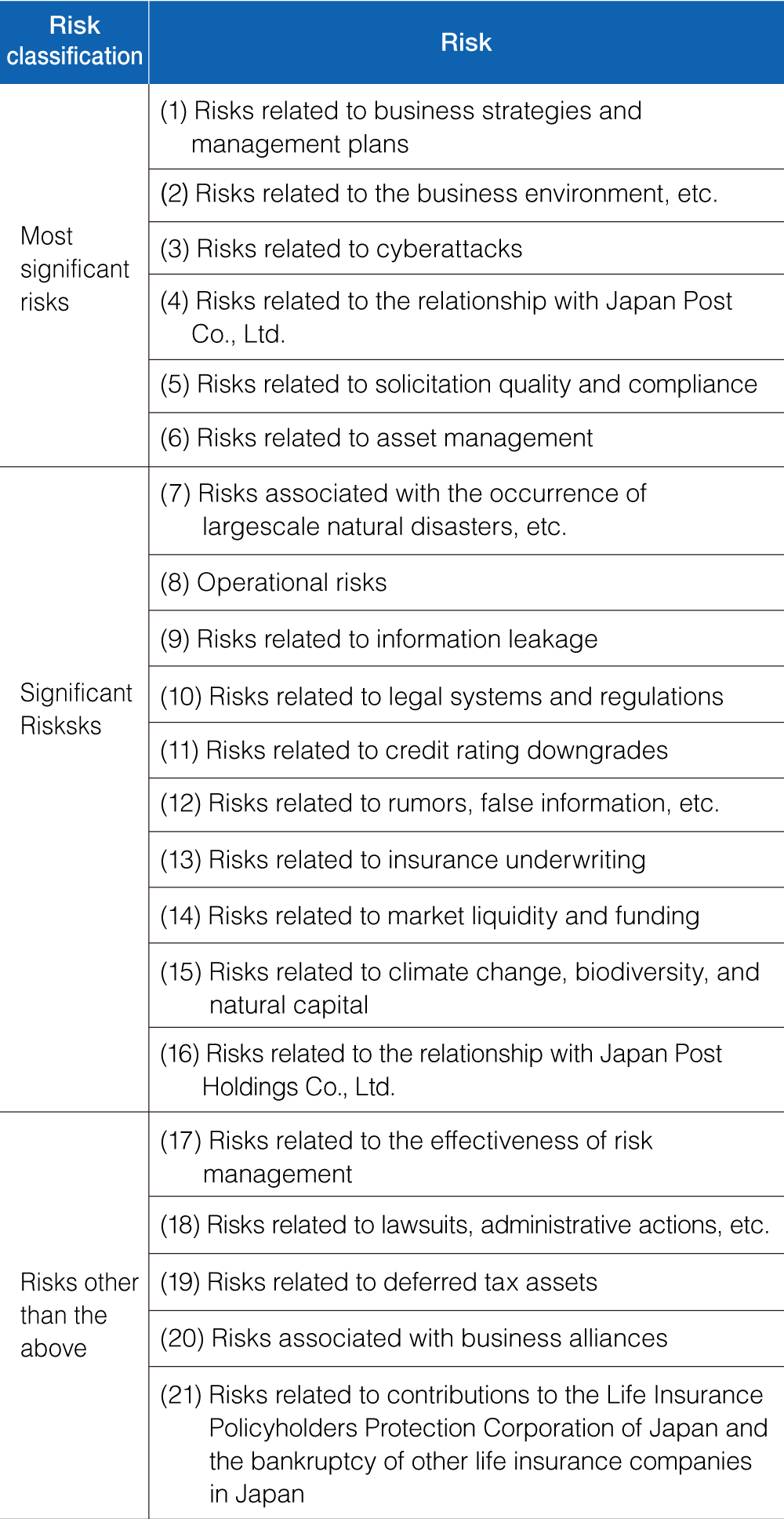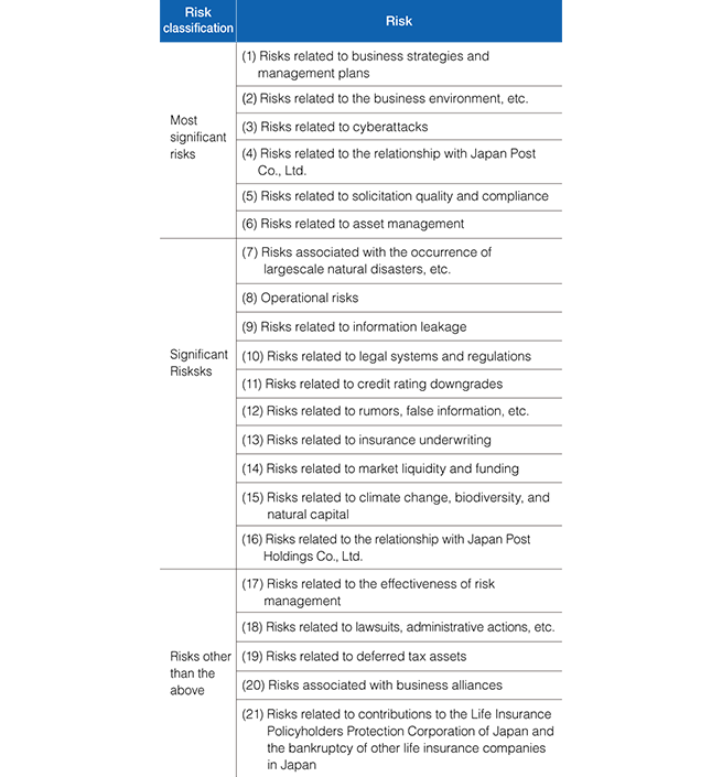 In enforcing risk management, we collaborate with the risk management departments of Japan Post Holdings Co., Ltd. and JAPAN POST INSURANCE SYSTEM SOLUTIONS Co., Ltd., the Company's subsidiary.