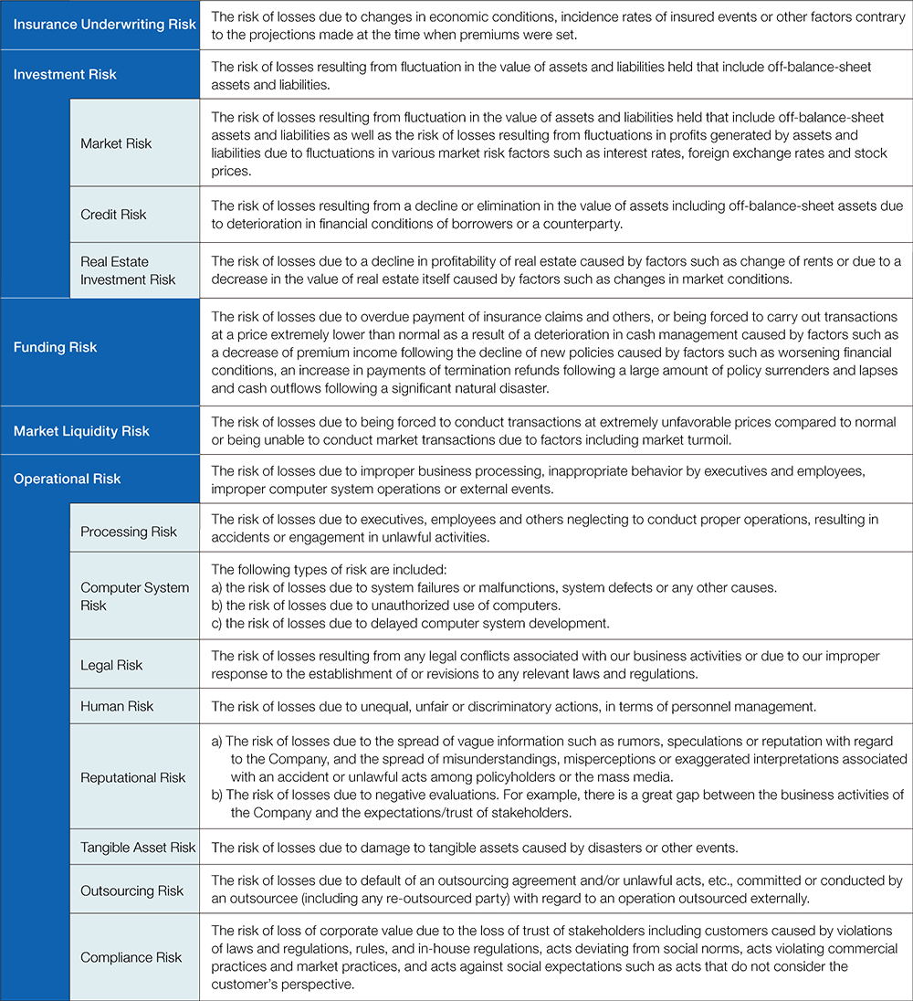 We classify and define types and details of managed risks into the following categories, and have established a management system and rules in accordance with each characteristic and are appropriately carrying out risk management.