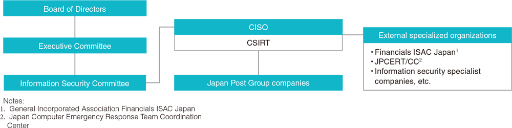 To carry out these activities, we have established the Information Security Committee within the Company. Management is taking the lead in promoting such measures, while working in cooperation with other companies in the Japan Post Group based on "Japan Post Group Executive Declaration on Cyber Security."