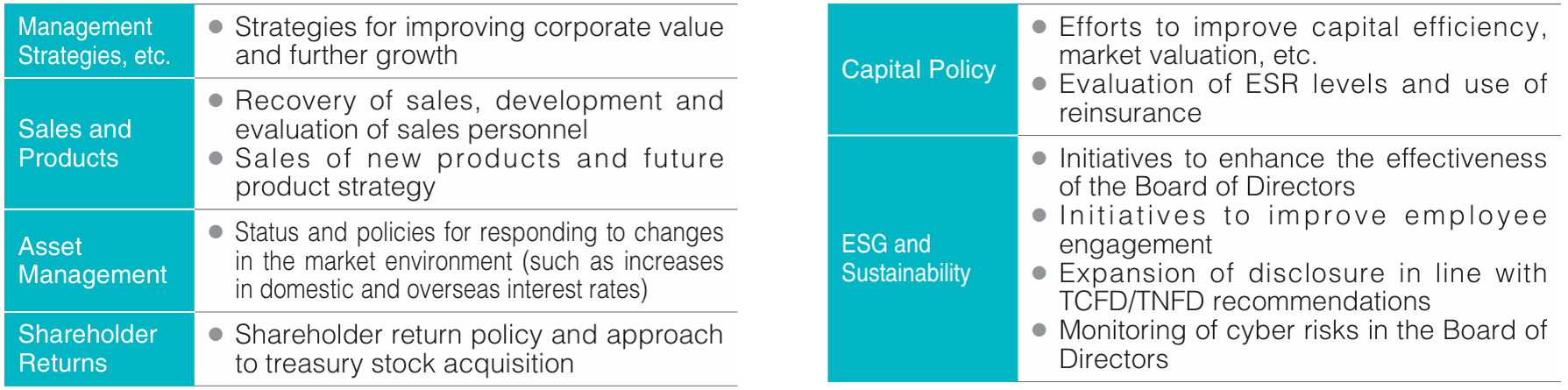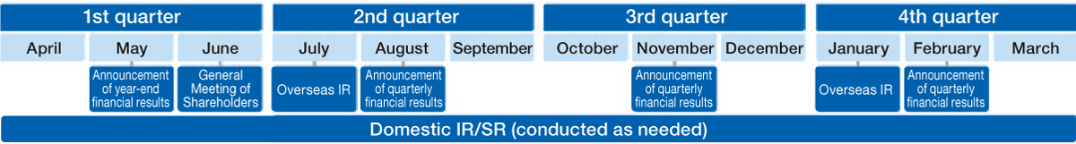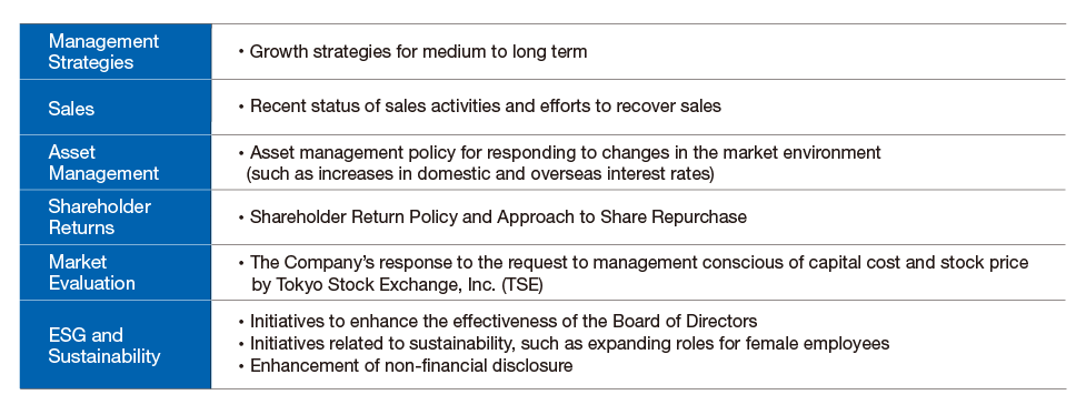 After the announcement of quarterly financial results, we hold conference calls and financial results briefings for institutional investors in Japan and overseas, and our management team explains management strategies and financial conditions. To respond to the interests of institutional investors, we also conduct dialogues through individual interviews. In the fiscal year ended March 31, 2024, we also held discussions between shareholders and Outside Directors on topics such as sustainability management and the agenda for the general meeting of shareholders.