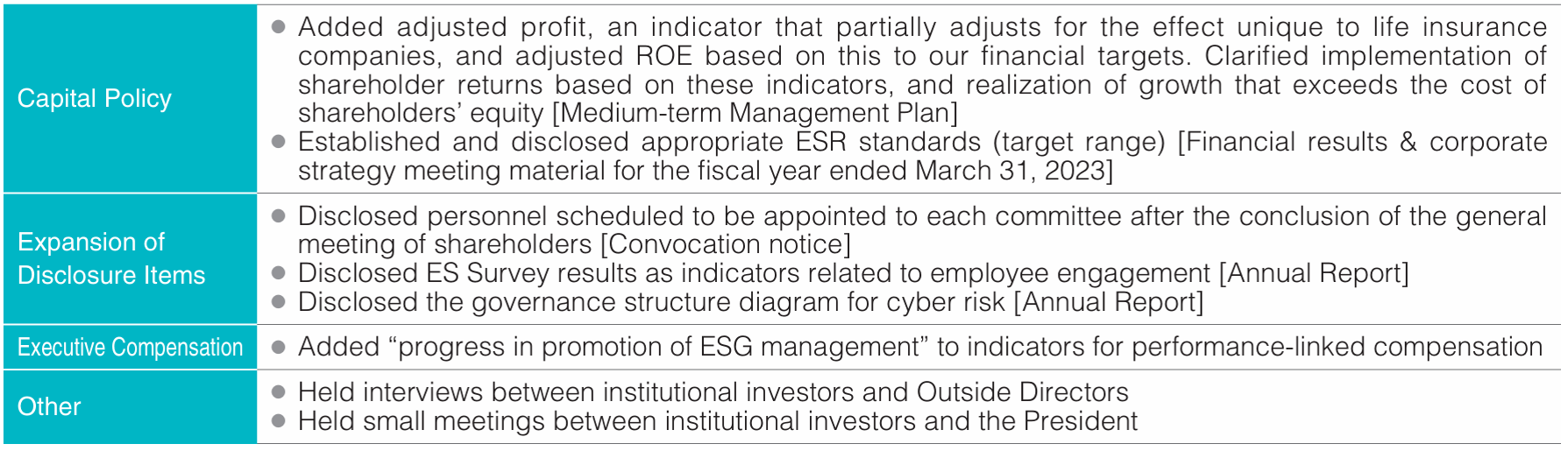 We also value constructive dialogue with shareholders and investors. We take in their insights gained through the dialogue and feed them back internally, including management. In this way, we link the input of our shareholders and investors to the sustainable growth of the Company and the enhancement of corporate value.