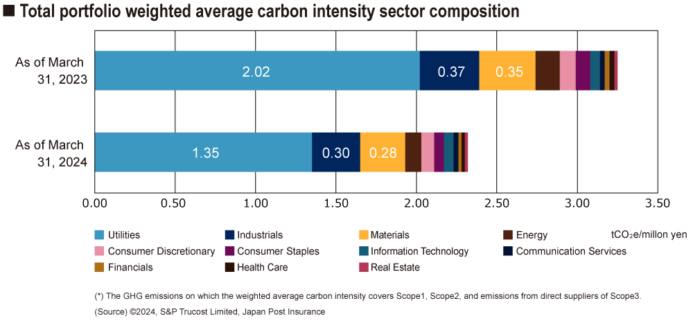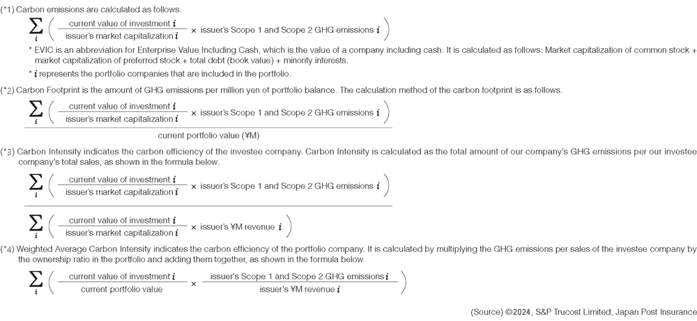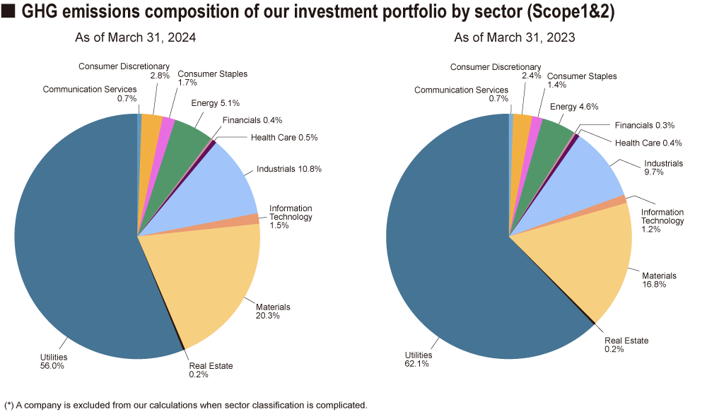 To assess climate-related risks and opportunities, our company has been measuring GHG emissions metrics (GHG emissions, carbon footprint, carbon intensity, and weighted average carbon intensity) for our investment portfolio (domestic and foreign equities, and domestic and foreign corporate bonds (including corporate financing))(*) since FY2020 (as of March 31, 2021). The measurement results for FY2023 (as of March 31, 2024) are as follows. Additionally, we have implemented measurements for other assets. For more details, please refer to our Responsible Investment Report.