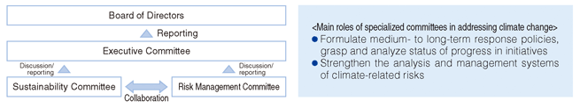 At the Company, the Sustainability Committee, chaired by the Executive Officer in charge of the Sustainability Promotion Department, and the Risk Management Committee, chaired by the Chief Risk Officer (CRO), review and discuss various issues related to climate change.