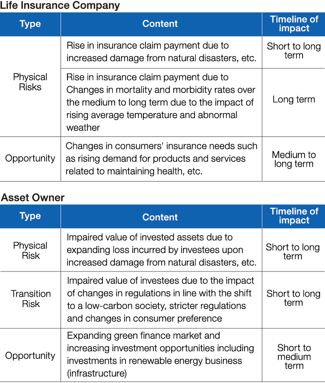 We recognize the impact (risks and opportunities) of climate change on the Company in both as a life insurance company and an asset owner, as follows.