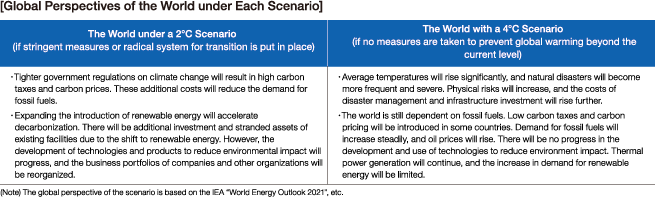 (*) References are made to scenarios from the IEA "World Energy Outlook," IEA reports, and "Synthesis Report on Observations, Projections, and Impact Assessments of Climate Change (2018): Climate Change and Its Impacts in Japan" from the Ministry of the Environment, et al.