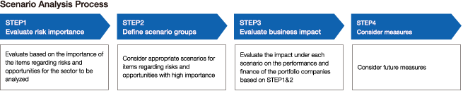 In STEP2, we assume specific situations under the 2℃ scenario and 4℃ scenario (*) for items of risks and opportunities with high importance by key sector identified in STEP1. In STEP3, we qualitatively evaluate their impact on the performance and finance of the portfolio companies.