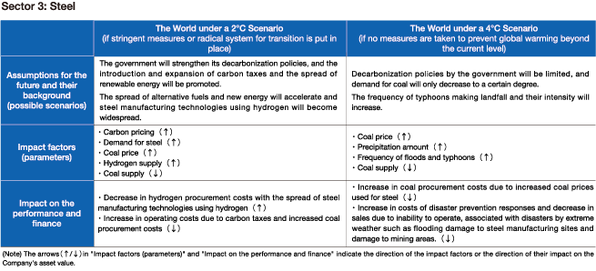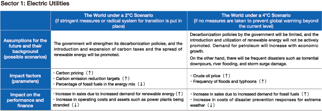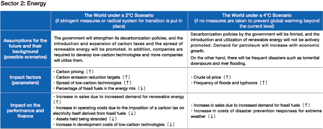 We analyzed the impact of 2℃ and 4℃ scenarios (*) on the following three sectors: electric utilities, steel, and energy, which were selected as the most important sectors that have a large impact on climate change and in which we have a large amount of investments and loans. As a result, we found that the introduction of a carbon tax, the spread of renewable energy, and other social changes may have a significant impact on the performance and finance of each sector under the 2℃ scenario.