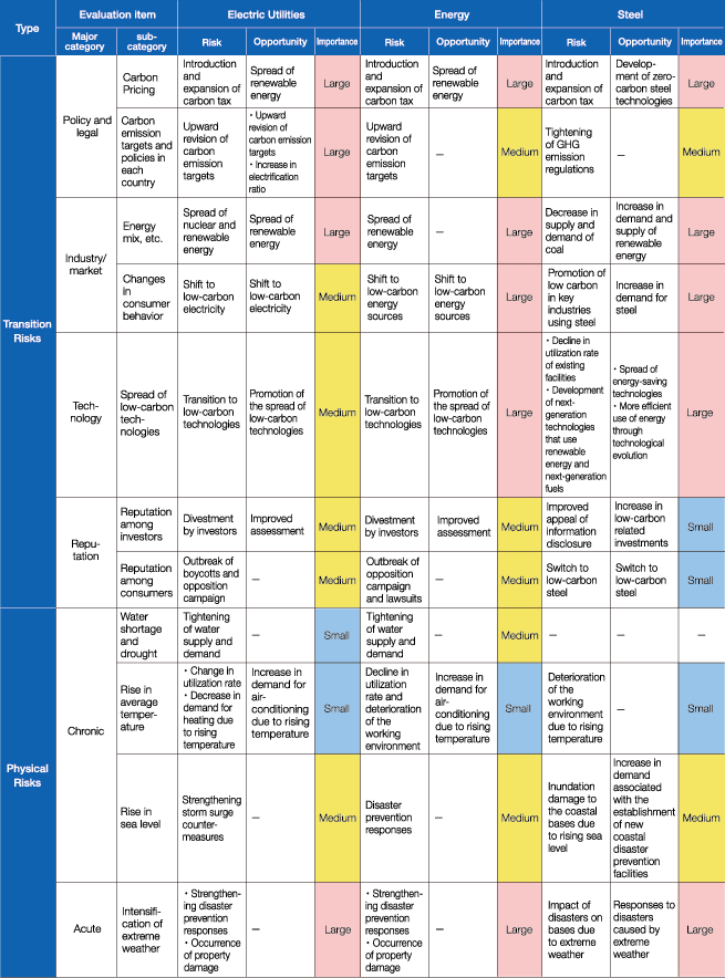 We evaluated the importance of risks and opportunities in three sectors that are important to the Company, based primarily on a survey of literature published by international organizations and other institutions, with assistance of outside experts.