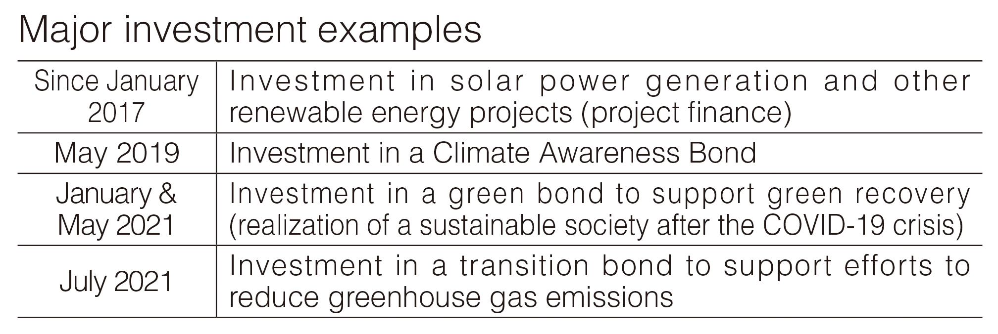 We are actively making investments that contribute to the decarbonization of society to promote the decarbonization of society. In addition to providing funds to the green finance market, we are actively pursuing investments in renewable energy.