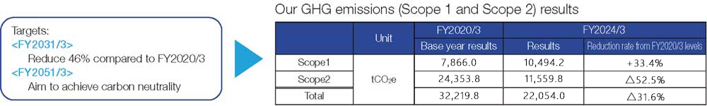 We have set the following greenhouse gas emissions (GHG emissions) reduction targets for Scope 1 (direct emissions from the company) and Scope 2 (emissions associated with the use of electricity and other resources supplied by other companies) (excluding increases due to new business), and are working toward achieving carbon neutrality. So far, we have reduced emissions by 31.6% as of the end of FY2023 through the use of electricity generated from renewable energy sources at large facilities occupied by the Company.