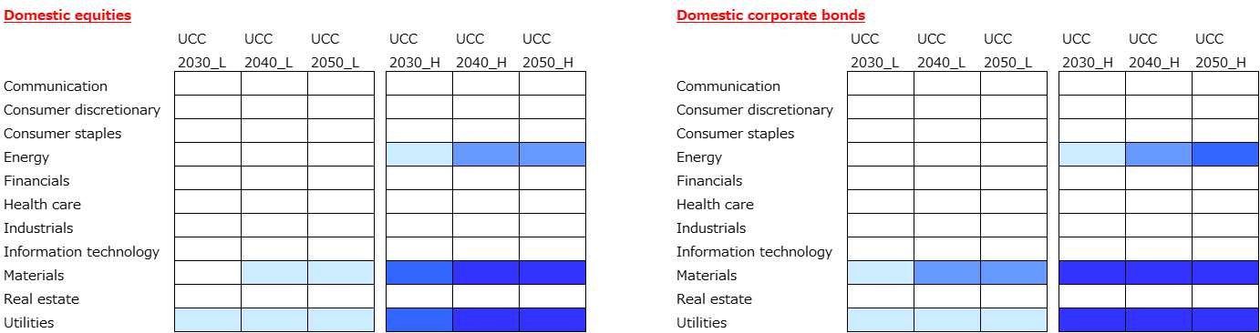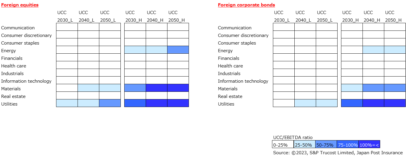 For all asset classes, carbon costs have a big impact on the finances of companies in three sectors: energy, materials, and utilities. In particular, it can be inferred that under the high carbon price scenario (H), which assumes that aggressive policies will be implemented to promote decarbonization, the financial risks in these sectors could be high.