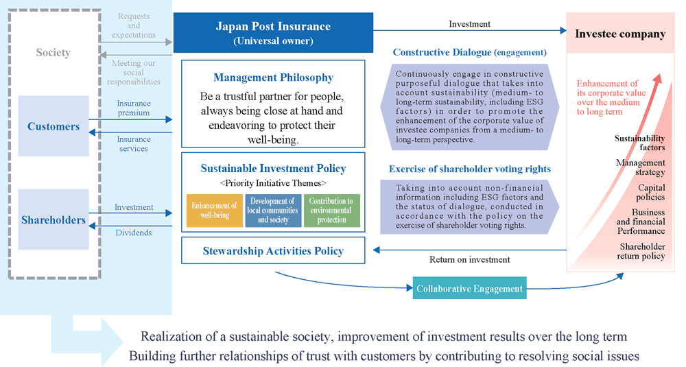 We have been promoting stewardship activities as a universal owner that manages diverse, long-term assets, in order to fulfill our responsibilities and respond appropriately to social demands for compliance with the Japan's Stewardship Code.