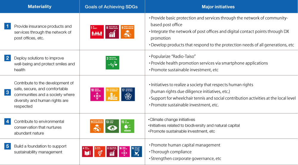 To fulfill our social mission of protecting our customers' lives by providing life insurance product, we position the provision of insurance services through post offices, branches, and the Retail Service Division as our primary materiality (important issues). We also conduct sustainable business operations that take people's health, diversity, human rights, and the environment into account.