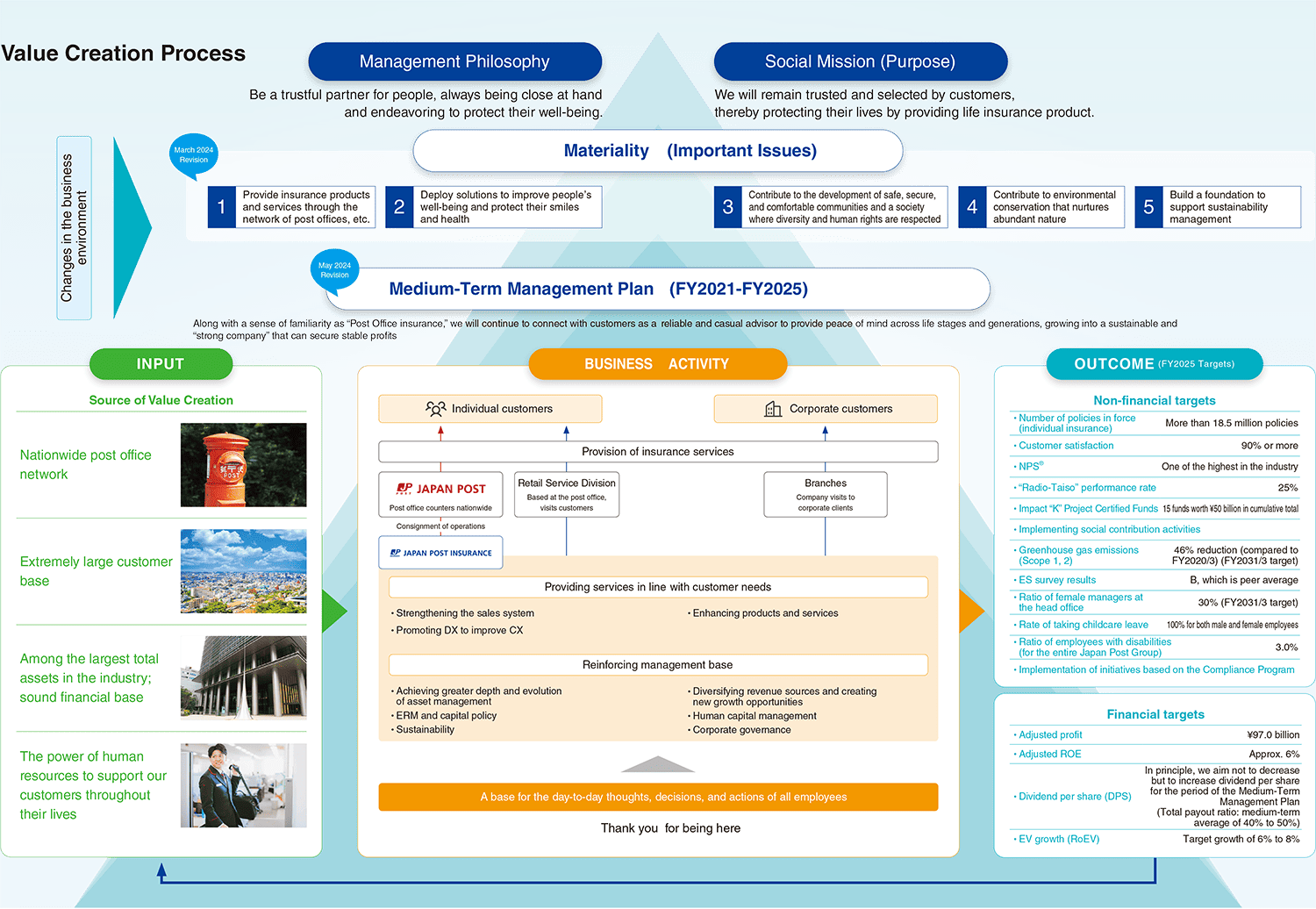 We aim to provide our stakeholders with value through our life insurance business. By continuously running the value creation cycle, we will enhance our corporate value over the medium to long term.