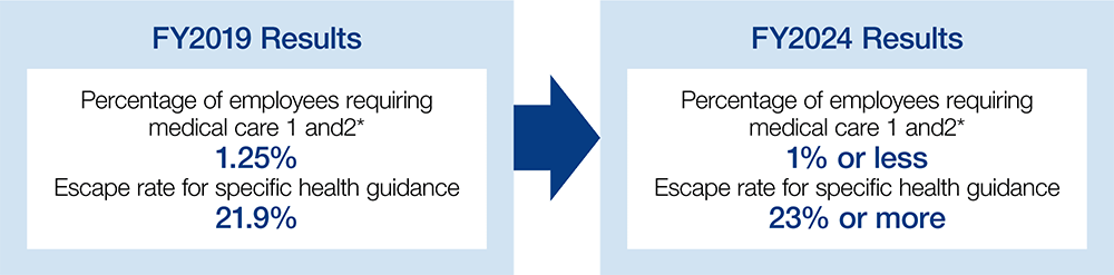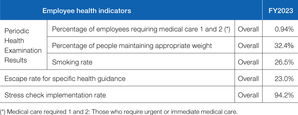 With the aim of curbing the number of employees who are unable to work normally due to health issues, we have set KPIs over the medium term to evaluate the status of employee health-related initiatives.