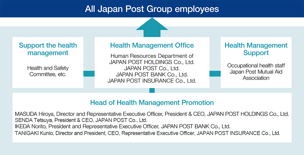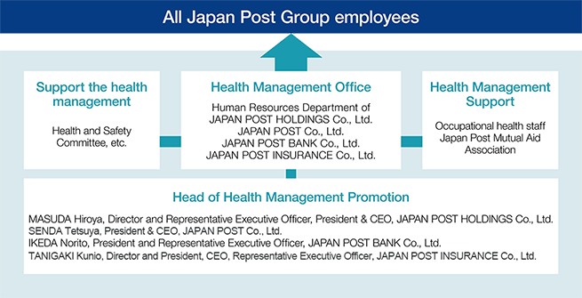 The presidents of the four Japan Post Group companies are responsible for promoting health management. The Health Management Office plays a central role in promoting the health management of the Japan Post Group in cooperation with occupational health staff, the Japan Post Mutual Aid Association, and internal health and safety committee, etc.